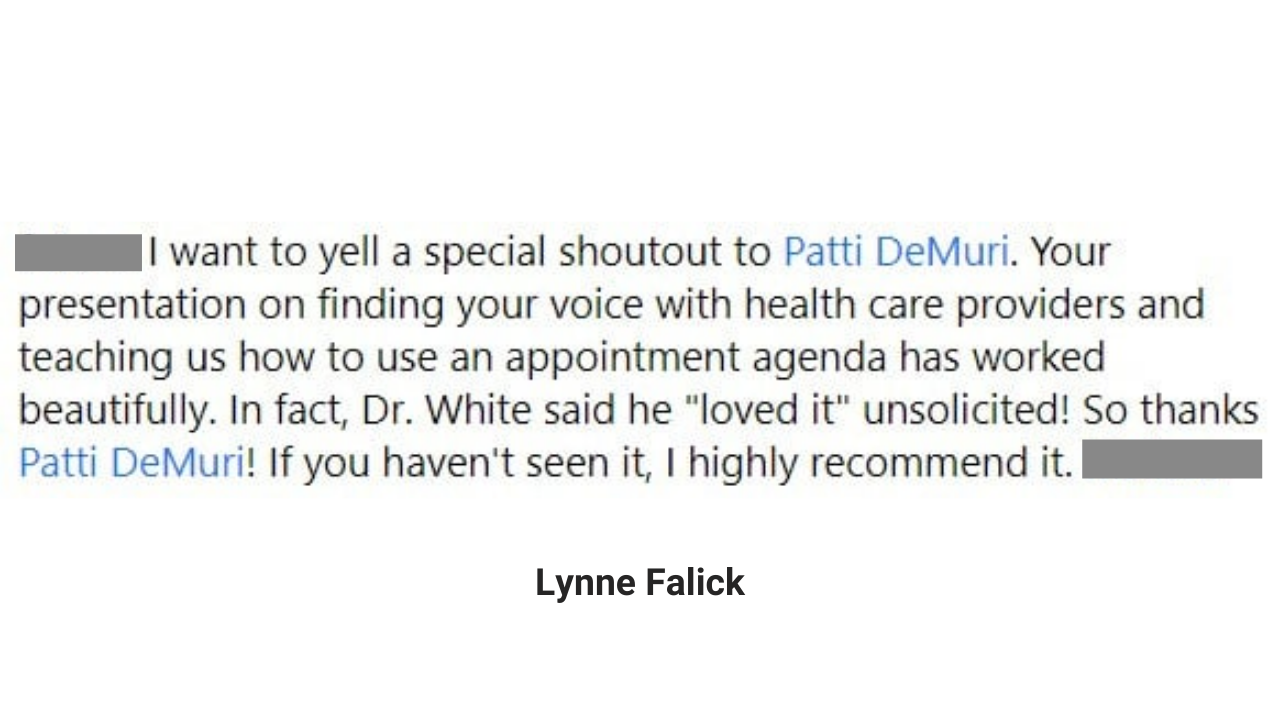 I help patients learn how to advocate for themselves through teaching, mentoring, and coaching in classes and our ongoing membership.